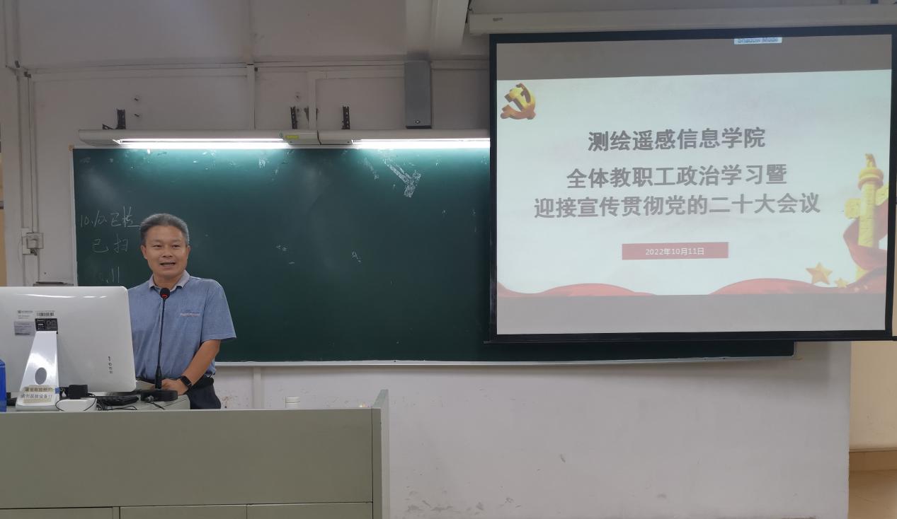 为认真学习贯彻习近平新时代中国特色社会主义思想,深入贯彻落实习近平总书记关于教育的重要论述及党中央、国务院重大决策部署,持续推进政治理论学习常态化和规范化,贯彻落实广东省第十三次党代会精神,坚持不懈把全面从严治党向纵深推进,深入学习《习近平谈治国理政》第四卷,严格纪律教育学习和师德师风建设要求,全面推进“双高计划”专业群建设工作,以实干实绩迎接党的二十大召开。10月11日,测绘遥感信息学院在天河校区西区综合楼406召开全体教职工政治学习会议暨迎接宣传贯彻党的二十大,学院党总支书记兼院长速云中主持会议并组织政治学习,学院全体教职工参加会议。