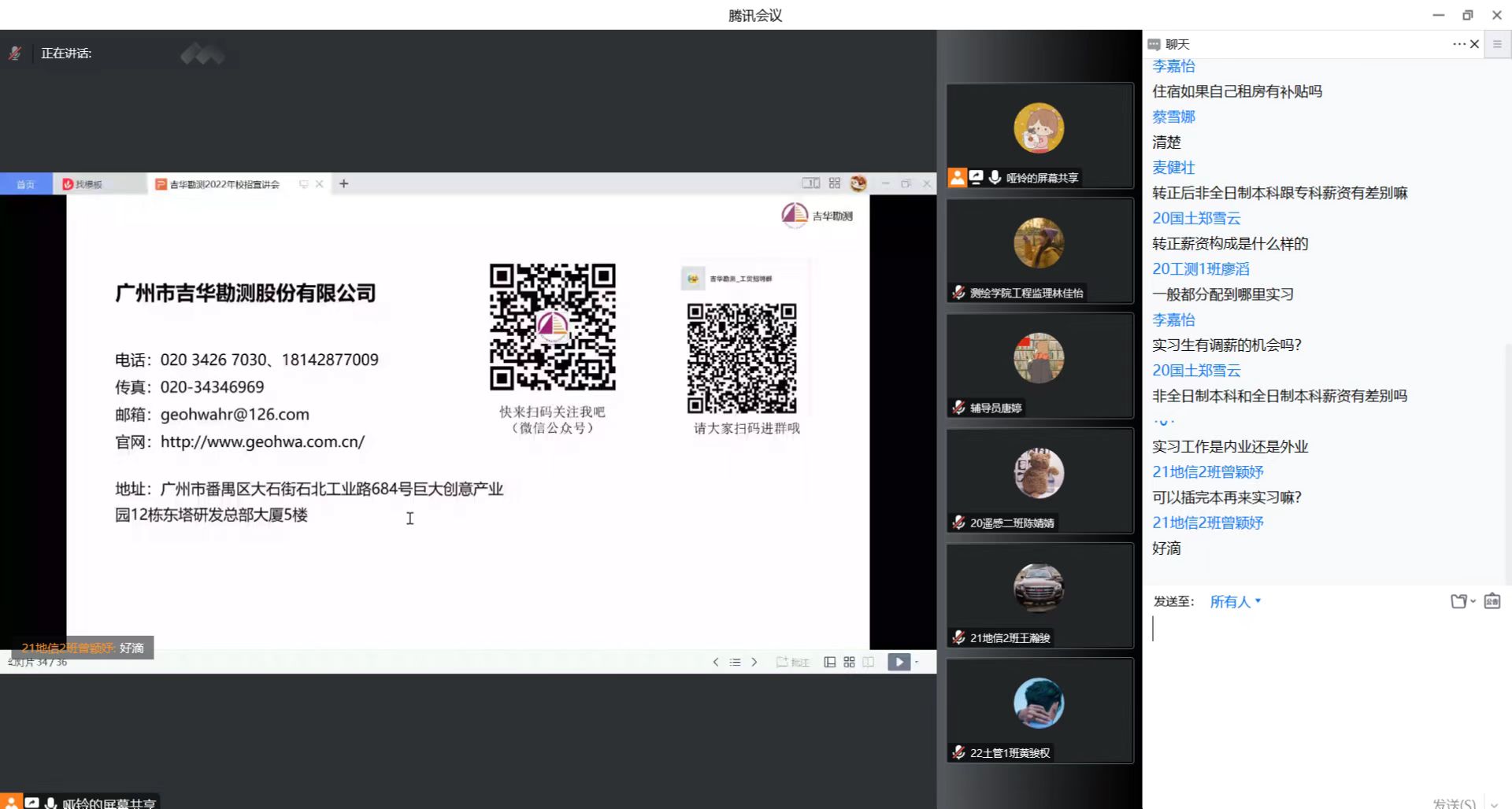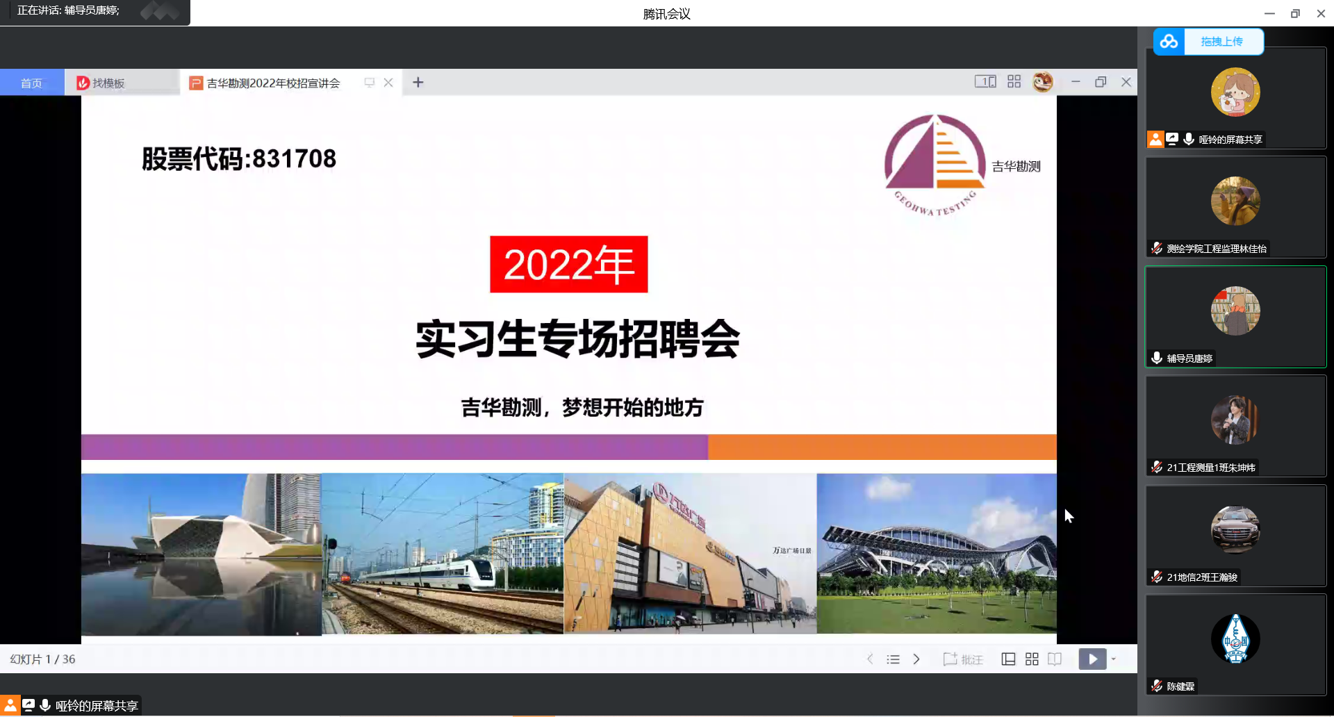 为全面贯彻落实教育部稳就业、促就业会议精神,促进校企供需精准对接,助力2023届毕业生顺利就业、充分就业、高质量就业,11月24日,测绘遥感信息学院邀请广州市吉华勘测股份有限公司开展线上专场招聘宣讲会。广州市吉华勘测股份有限公司人事邓雅玲、测绘遥感信息学院党总支副书记李元、就业联络员唐婷以及200余名2023届毕业生参加了本次宣讲会。