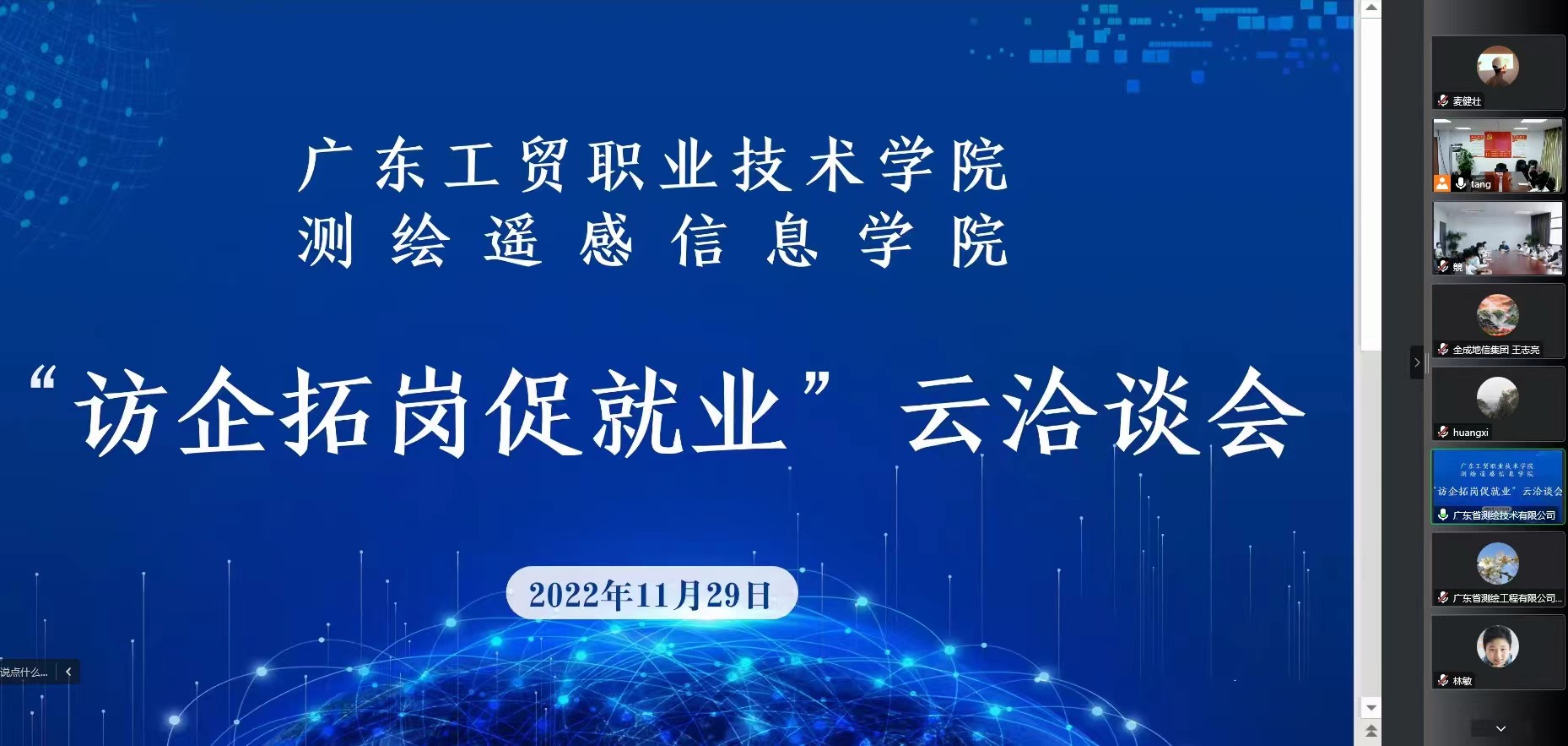 为深入学习贯彻党的二十大精神,实施就业优先战略,全面落实教育部关于2023届全国普通高校毕业生就业创业工作部署,11月29日,测绘遥感信息学院在天河校区西区第一会议室召开“访企拓岗促就业”云洽谈会。100%精准出码规律资料网站党委副书记、校长何汉武莅临本次云洽谈会,广州南方测绘科技股份有限公司人力资源管理中心总监黄曦、广东省测绘工程有限公司人事部胡春兰、广东省测绘技术有限公司副总经理吴志军和总工程师邹威、广东宇恒空间信息技术有限公司副总经理任志平以及广州全成多维信息技术有限公司董事长孙照辉等企业领导和代表出席了本次会议。此外,测绘遥感信息学院党总支书记兼院长速云中、党总支副书记李元、副院长高照忠、全体教师、2020级及2021及学生代表共同参会,会议由李元主持。