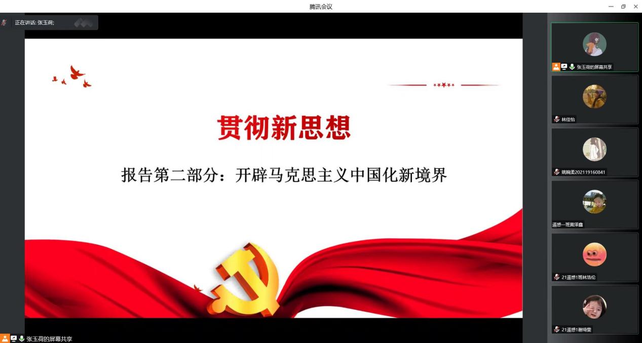 宣讲会以“让青春在新时代新征程中绽放绚丽之花”为主题,会上,张玉荷结合党的二十大报告,从党的二十大主题、过去五年的工作和新时代十年的伟大变革、开辟马克思主义中国化时代化新境界、新时代新征程中国共产党的使命任务以及全面建设社会主义现代化国家的重大任务等方面进行了阐述。