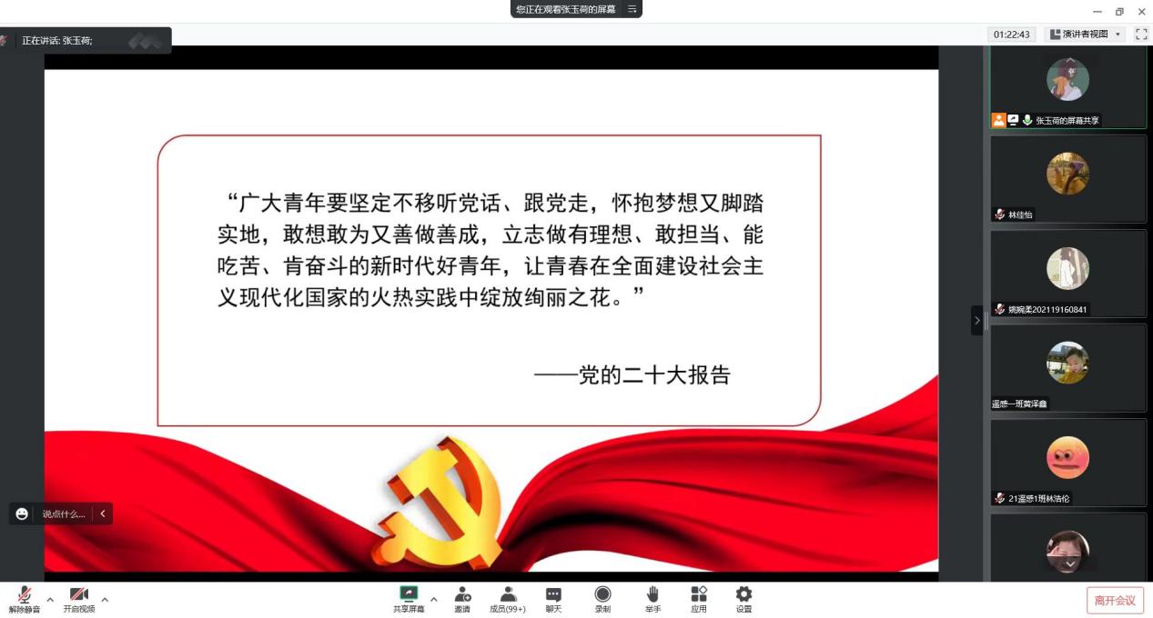 此外,张玉荷向同学们介绍了国家“双高”专业群的建设情况以及学校、学院“十四五”规划的相关内容。她勉励全体青年要以党的二十大精神为指引,扎扎实实练好本领,以实际行动助推学校“双高”建设和“十四五”事业发展,随时做好准备为党奉献、为国担当。