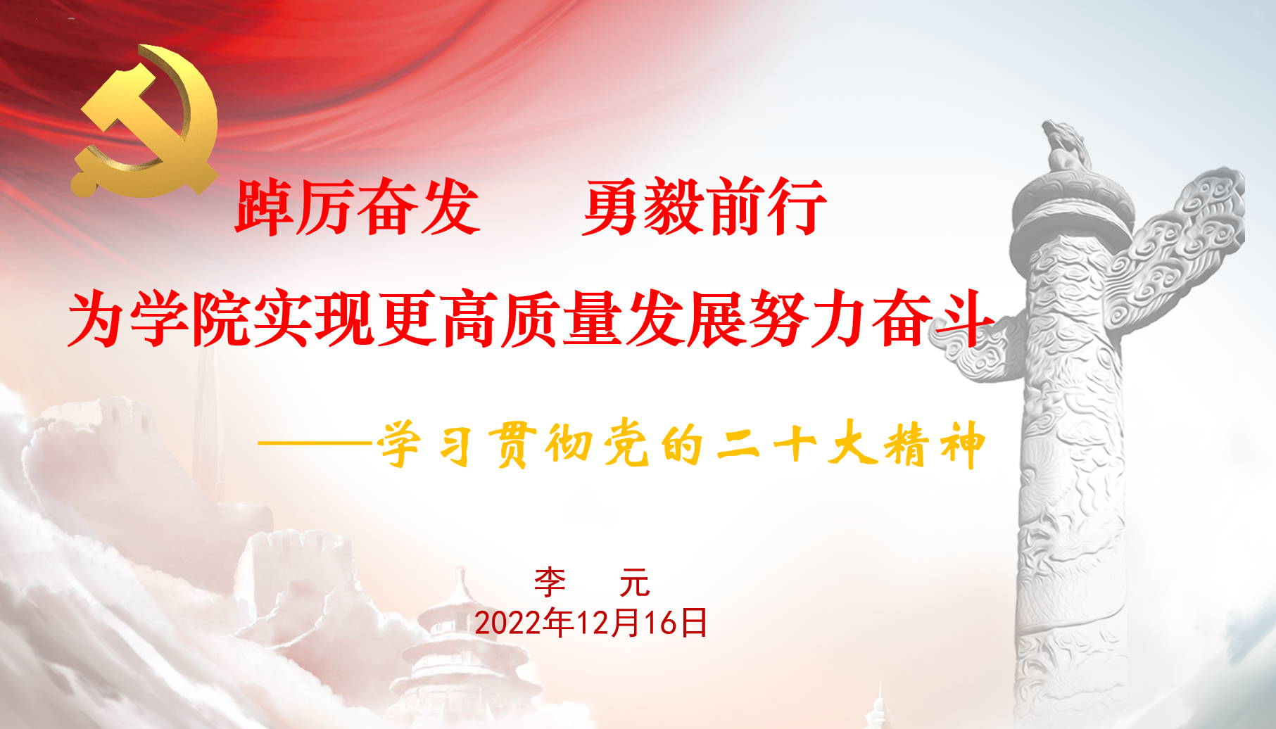 李元为与会人员系统深入解读了党的二十大的主题、三个务必以及过去五年的工作和新时代十年的伟大变革等15个内容要点,引导师生整体掌握党的二十大报告的重要意义和精神要义。她指出,党的二十大是在全党全国各族人民迈上全面建设社会主义现代化国家新征程、向第二个百年奋斗目标进军的关键时刻召开的一次十分重要的大会,具有无比重大和深远的里程碑意义。