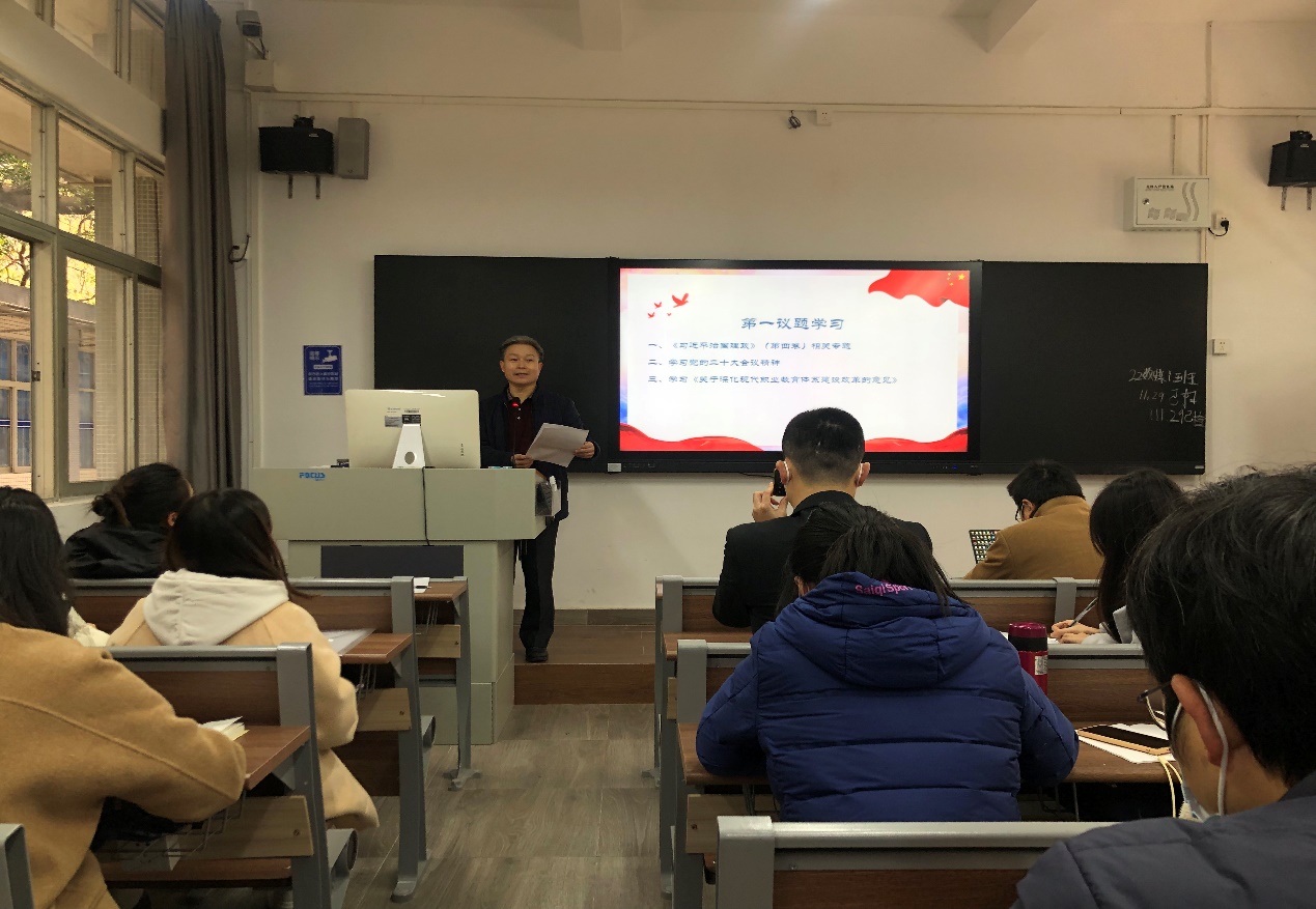 首先,速云中带领全体职工共同学习《习近平谈治国理政》第四卷选篇内容《坚持人民至上》,强调坚持以人民为中心的发展思想,不是一句空洞的口号,坚持以学生为中心的服务理念也不是一句空洞的口号,必须将各项决策部署落实到实际工作之中。中国共产党领导下的广大教师和党员需深入学习政治理论、扎实专业技能、提升教学水平,切实增强自身工作素养和本领,在实践中指导学生、关心学生、帮助学生,做好教书育人工作,同时要牢牢把握学校意识形态工作领导权,把思想政治工作贯穿学校教育管理全过程。接着,速云中带领大家重新再学习了党的二十大报告中关于教育的重要论述,强调教育、科技、人才是全面建设社会主义现代化国家的基础性、战略性支撑。要坚持教育优先发展、科技自立自强、人才引领驱动,坚持为党育人、为国育才,深入开展社会主义核心价值观宣传教育,全面提高人才自主培养质量,着力培养担当民族复兴大任的时代新人。结合党中央国务院《关于深入现代职业教育体系建设改革的意见》的内容和精神,他指出《意见》是党的二十大召开后,党中央、国务院部署教育改革工作的首个指导性文件,是为深入贯彻落实党中央关于职业教育工作的决策部署和习近平总书记有关重要指示批示精神,持续推进现代职业教育体系建设改革,优化职业教育类型定位而提出的意见。可以看到,党的二十大对职业教育重视程度之高是前所未有的,职业教育在整个教育体系中的份量之重越来越凸显出重要地位,深化现代职业教育体系建设改革的任务之艰巨也前所未有。作为职业教育工作者,要从《意见》的总体要求、战略任务、重点工作、组织实施等方面进行深入学习,进一步认识职业教育的育人使命,明确了职业教育的发展目标。