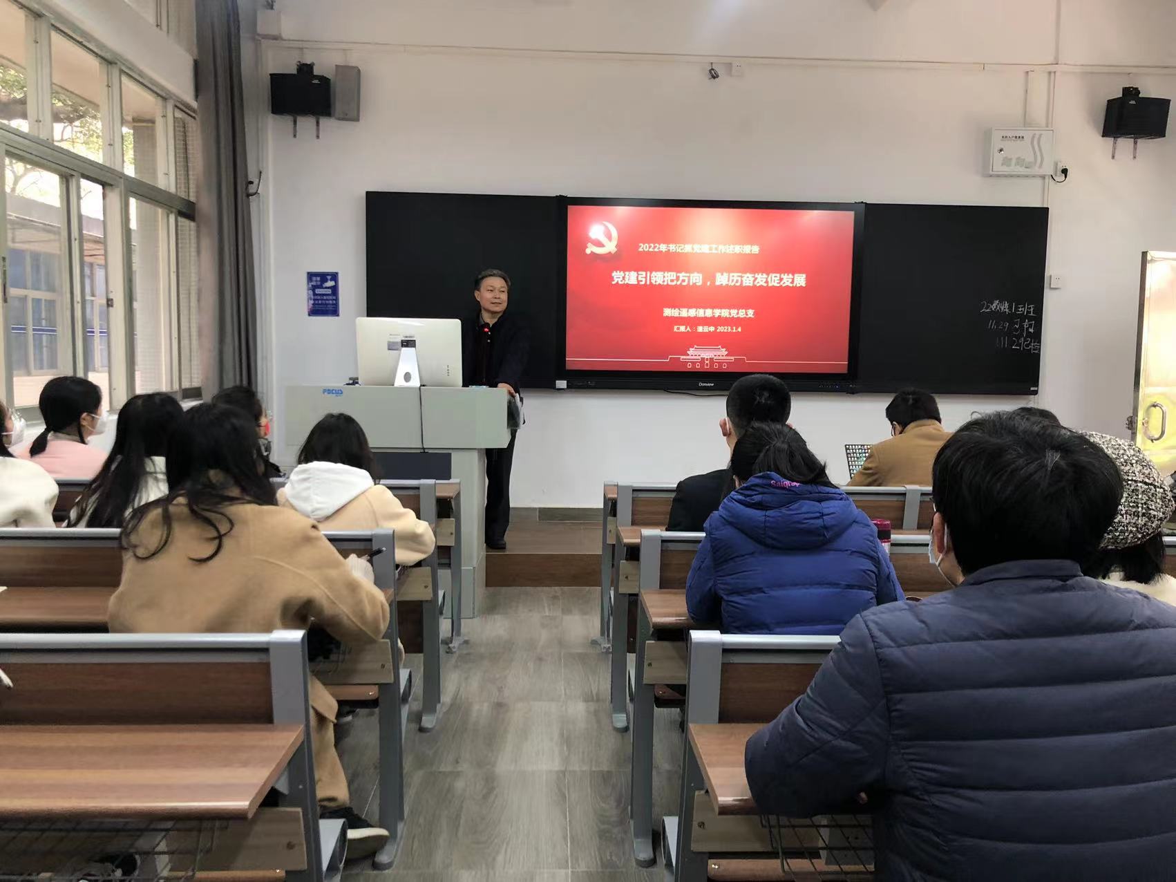 会议第二项议程,速云中分别向全体职工作了题为《党建引领把方向,踔厉奋发促发展》和《高质量完成“双高”与提质培优建设任务,奋力建设“多元参与、产教融合、科教融汇、行企认可”的高水平新型职教二级学院》两个工作报告。首先从明思路、定措施、抓落实、亮点与创新点、存在的突出问题、改进措施和努力方向等方面进行全方位汇报。在习近平新时代中国特色社会主义思想引领下,2022年测绘学院重视学院的高质量发展,把推进双高专业群建设和促进学院繁荣发展作为基础工程和战略任务来抓,在专业建设、科学研究、人才培养、育人平台、社会服务等方面谋划,在发展气象上呈现了新的风貌,学院整体建设取得积极的成效。