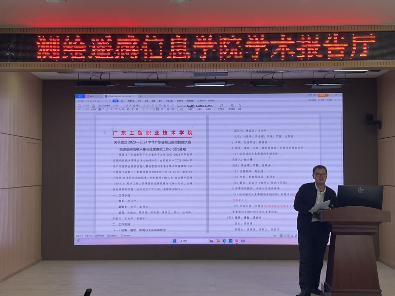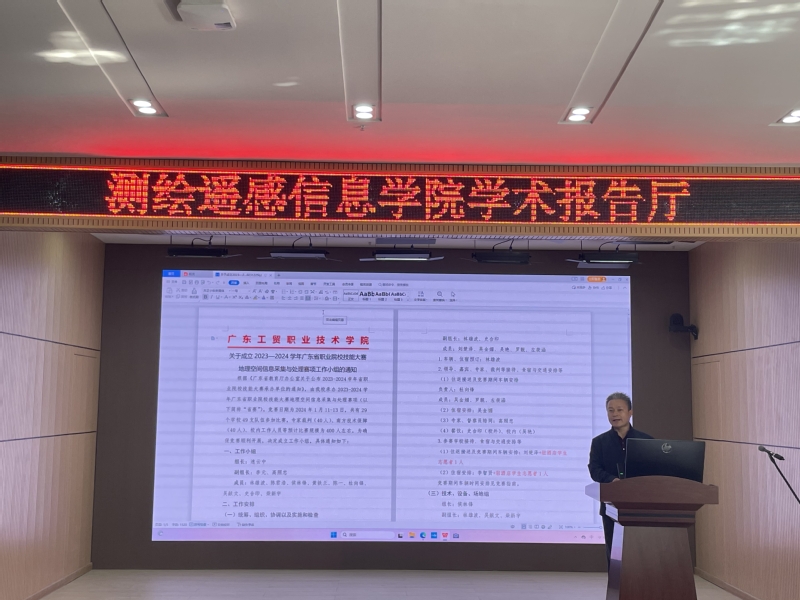 2024年1月5日14:00,测绘遥感信息学院在白云校区图书信息楼2区五楼报告厅召开关于承办广东省职业院校技能大赛地理空间信息采集与处理赛项(以下简称“省赛”)工作推进会议。测绘遥感信息学院党总支书记、院长速云中主持会议,党总支副书记李元、副院长高照忠、测绘工程系主任侯林锋、办公室主任林雄波、学工办主任陈君浩、各项目负责人及相关工作人员参加本次会议。