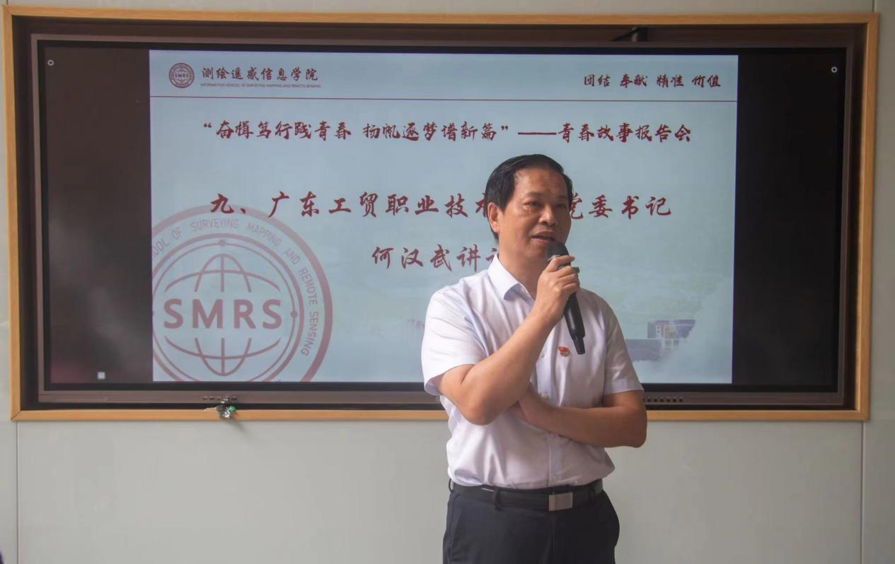最后,何汉武从三个角度切入作总结讲话。一是对参与此次分享的5名青年学生代表与2名教师代表表示充分的赞扬与肯定。他提出,测绘学院此次开展的青春故事报告会形式新颖,对学生的个人成长与发展具有积极的示范引领作用。二是强调党纪学习教育的重要性。各级党组织要认真贯彻落实上级要求,扎实开展党纪学习教育,引导广大党员进一步强化纪律意识、加强自我约束、提高免疫能力,增强政治定力、纪律定力、道德定力、抵腐定力,始终做到忠诚干净担当。三是表达对毕业生的祝愿与期待,希望测绘学院的优秀学子走出校门,能继续保持工贸人的奋斗基因、工匠精神、卓越品质、家国情怀,在新时代奏响属于工贸人的胜利凯歌!