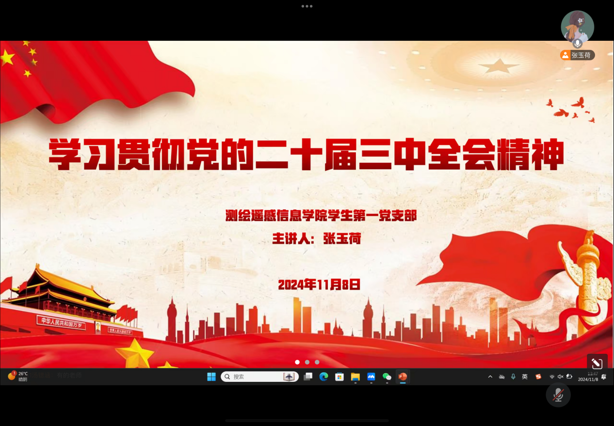 为深入学习贯彻党的二十届三中全会精神,2024年11月8下午,测绘遥感信息学院学生第一党支部采用线上方式开展学习贯彻党的二十届三中全会精神专题党课宣讲,由支部书记张玉荷主讲,支部全体党员参与学习。
