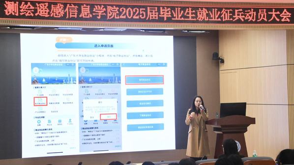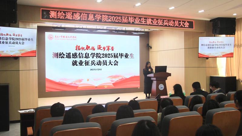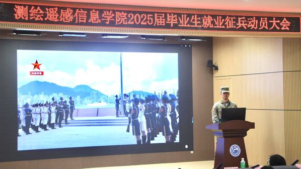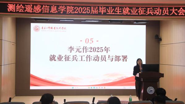 为深入学习贯彻党的二十届三中全会精神和广东省2025届普通高校毕业生就业创业工作会议精神,响应国家大学生征兵入伍政策,切实推进2025届毕业生就业和征兵工作,1月9日下午,测绘遥感信息学院召开2025届毕业生就业征兵动员大会。学校党委委员、副校长唐毓秋,学院党总支书记李元、副书记陈君浩,学院毕业班班主任、辅导员以及2025届毕业生参加了本次大会。