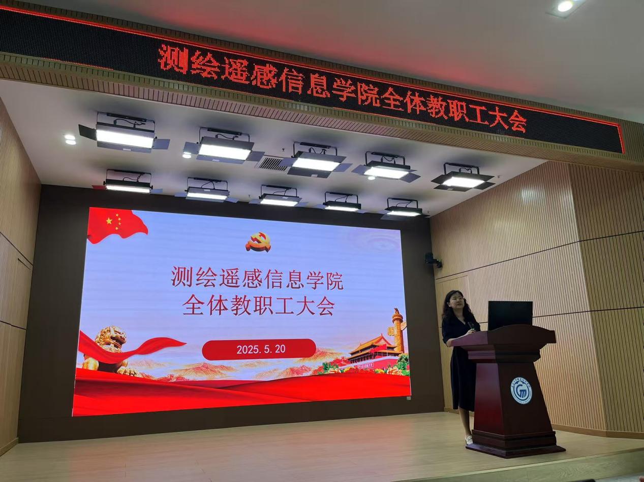 2025年5月20日下午,测绘遥感信息学院在白云校区博学楼5楼报告厅召开全体教职工大会暨政治理论学习会议,学院党总支书记李元、副书记陈君浩、副院长黄铁兰、刘丽及全体教职工参加会议,会议由李元主持。