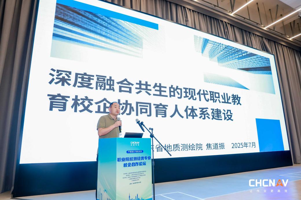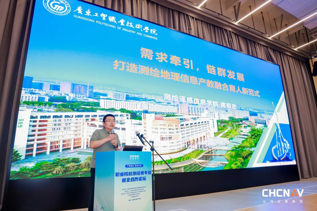 在“校企同频,共育新机”主论坛环节,高照忠院长以“需求牵引,链主引领,打造测绘地理信息产教融合育人新范式”为题作报告。他指出,学院紧密对接粤港澳大湾区智慧城市、低空经济等产业升级需求,以“链主企业”为引领,构建了“课程-项目-岗位”全链条融合培养体系。通过引入企业真实生产项目、共建数字化实训平台,实现教学内容与行业技术发展同步迭代。高院长特别分享了学院自第一期国家双高计划以来,在测绘地理信息产业育人范式上所做的探索与成果。