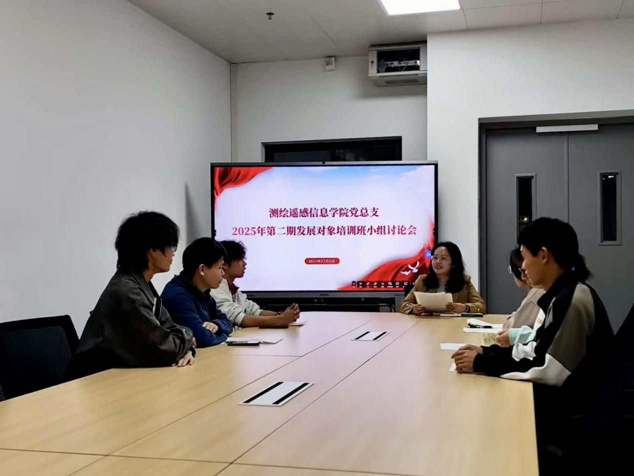 为深入学习贯彻党的二十届四中全会精神,严把党员发展质量关,2025年12月1日,测绘遥感信息学院党总支在图书馆2-405室组织召开2025年第二期发展对象培训班小组讨论会。会议由学院专职组织员唐婷主持,全体培训班学员参加。