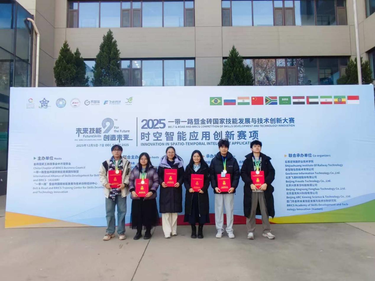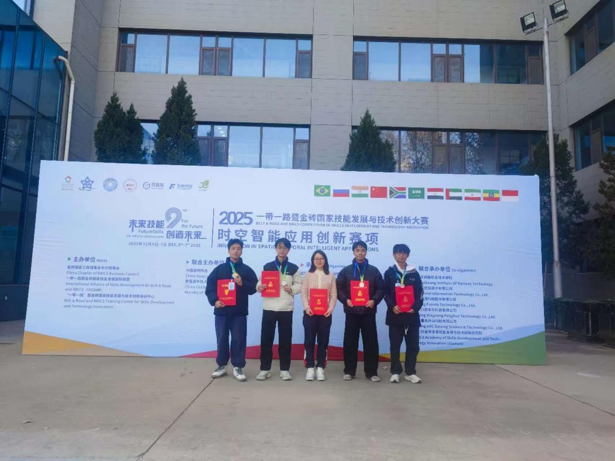 12月6日,2025一带一路暨金砖国家技能发展与技术创新大赛之时空智能应用创新赛项国内赛决赛在石家庄铁路职业技术学院成功举办。本次大赛吸引了来自全国多所985、211重点本科院校及高职院校的师生同台竞技,竞争激烈。在学院领导和实训中心的大力支持下,测绘学院师生积极备赛、迎难而上。最终,在教师组的角逐中,常德娥荣获三等奖,吴萍昊荣获优秀奖。学生组方面,由张瑜、刘焕、朱志航、麦润殷同学组成的队伍(指导教师:常德娥、巢子豪)荣获高职组二等奖;由廖雪彤、莫志程、何俊熙、吴森城同学组成的队伍(指导教师:吴萍昊、邱献引)荣获高职组三等奖。