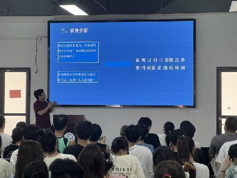 培训会上,王坤明首先详细讲解了职教赛道和红旅赛道网评PPT以及项目计划书的制作要点,并对常见易错点以及难点进行分析并提供具体化可执行的解决方案。其次,给所有参训人员展示了不同赛道的优秀获奖作品,引导同学们学会如何抓住得分要点。最后,各个项目组通过借鉴校内外优秀案例成功做法,发散思维去寻找自身参赛材料中存在问题,并不断进行完善与优化。