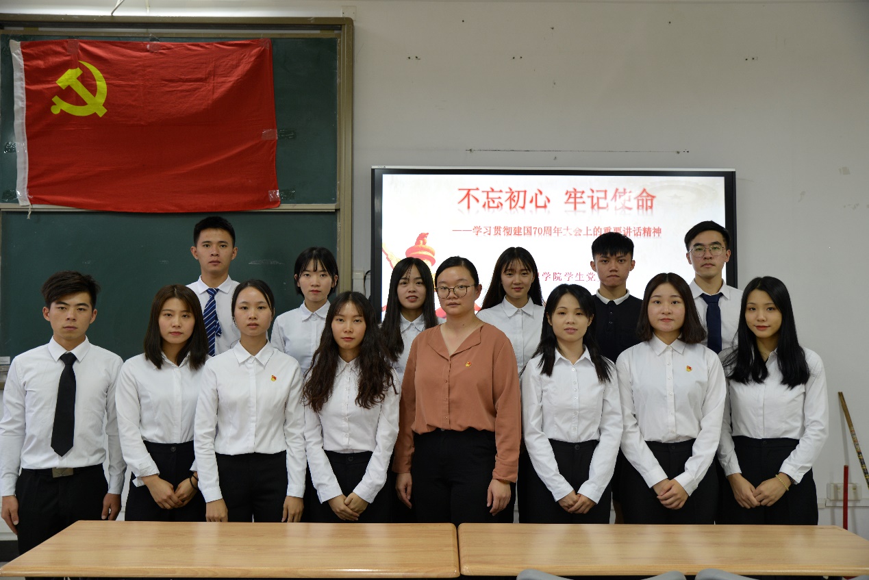 为深刻学习贯彻习近平总书记在庆祝新中国成立七十周年大会上的重要讲话精神,进一步激发支部党员的初心使命意识,提高党员的思想政治素养,2019年10月15日下午两点,汽车工程学院学生党支部于教学楼1区407课室开展“不忘初心、牢记使命——学习贯彻习近平总书记在庆祝中华人民共和国成立七十周大会上的重要讲话精神”专题党课学习活动,此次党课由学生党支部书记刘彩云主讲。