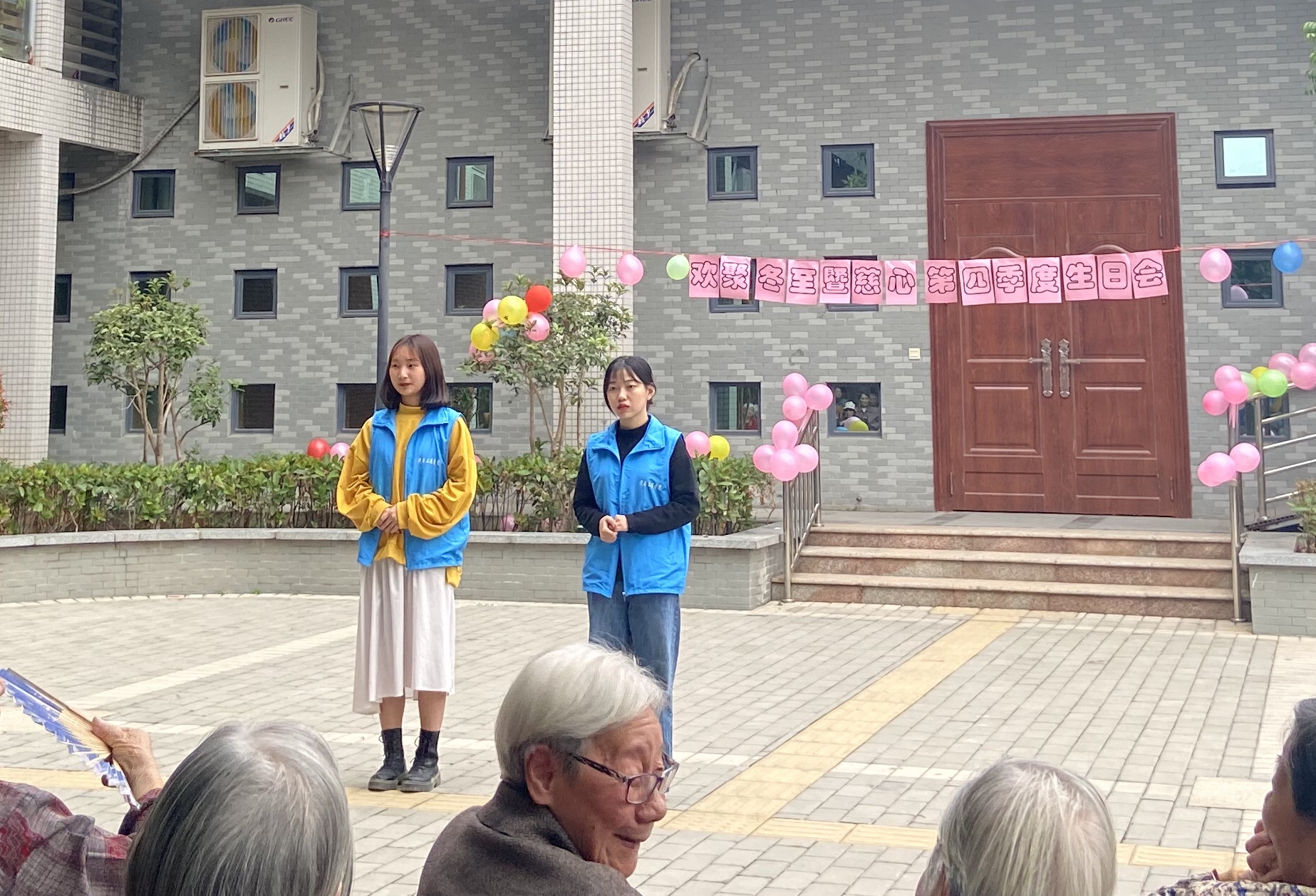 生日会主持人 志愿者们准时到达老人院,在社工的引领下开始了井然有序的布场,吹气球、挂彩字、调音响、为爷爷奶奶们戴上生日头饰等。布完场,紧接着生日会开始了,作为此次生日会主持人,以幽默风趣的方式开场,引得全场的人大笑,现场的氛围融洽温馨。