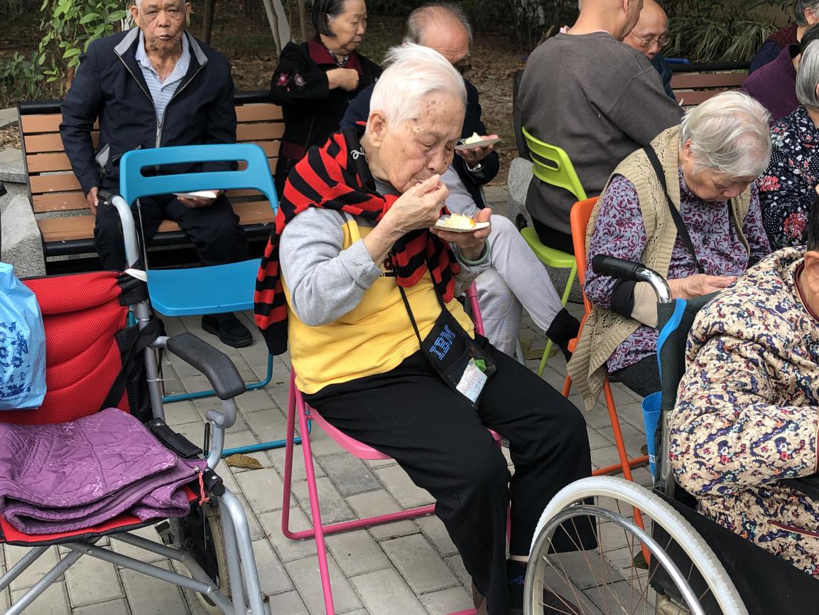 志愿者帮助老人吃蛋糕