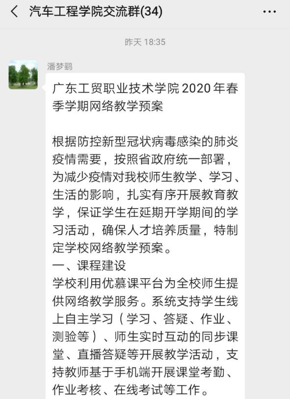 学院开展防疫知识宣传 二、线上课程,为新学期教学保驾护航 疫情来势汹汹,持续一个多月仍然未见消退的迹象。但学院教学、科研及专业建设工作不能因此而停滞。学院积极响应学校的号召,加紧开展教学工作准备。为了确保新学期课程正常开展,汽车工程学院党政领导动员全体教师开展信息化教学,将课堂教学转化为网络授课,重新编写教案,录制课程并开设网上答疑。同时,新学期即将迎来的技能竞赛也通过网络模式进行。在全院形成了一种“党总支号召——党员为先锋——全体教师积极参与”的氛围。短短两周时间,共建设了36门网络课,为新学期教学保驾护航。