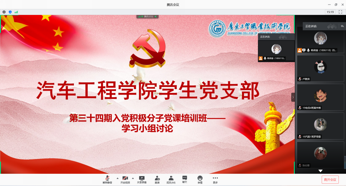 会议现场 会议伊始,主持人赖燕瑜同志就本次学习活动的目的做了简单说明,全体学员以小组为单位,讨论并分享自己对于正确入党动机的认识。在讨论期间,积极分子们踊跃发言,积极分享。19新能源1班张龙珠发表了自己的观点:对祖国和人民充满热爱,愿意全心全意为人民服务,在建设中国特色社会主义、实现中华民族伟大复兴、祖国繁荣安康的过程中,能做出自己力所能及的贡献。19汽服2班陆安宇结合自身立足当下,眼眺未来,认为作为一名积极分子,学习是现阶段的首要任务,拥有知识,将来与祖国一起完成中国梦。
