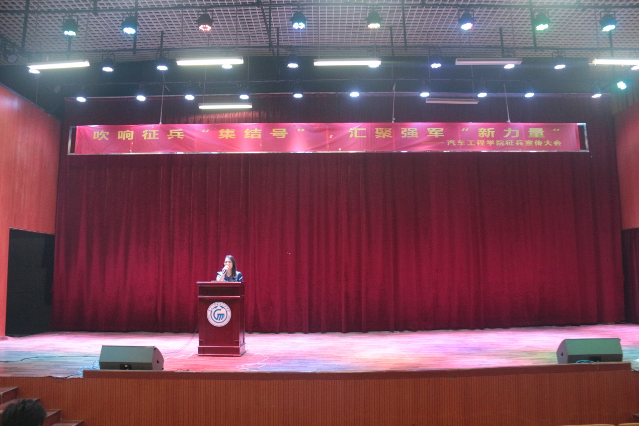 为切实做好2021届毕业生的就业和征兵工作,汽车工程学院于513日在明德楼演艺厅举行2021届毕业生大会暨“吹响征兵集结号,汇聚强军新力量”主题征兵宣传会。副校长唐毓秋、院长王艳芬、副院长潘梦鹞、党总支副书记欧敏出席,学院辅导员及全体毕业生参加了本次大会。会议由党总支副书记欧敏主持。