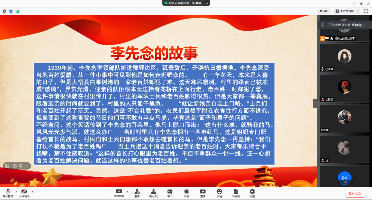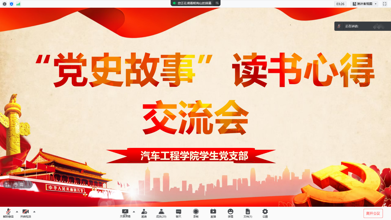 党一百年的光华岁月,历尽千帆,波澜壮阔。为了进一步深化党史学习教育,弘扬爱党爱国爱民族精神,激发大学生青年心向党、跟党走的高尚情怀。6月15日下午14:00,汽车工程学院学生党支部在线上开展“党史故事”读书心得交流会。