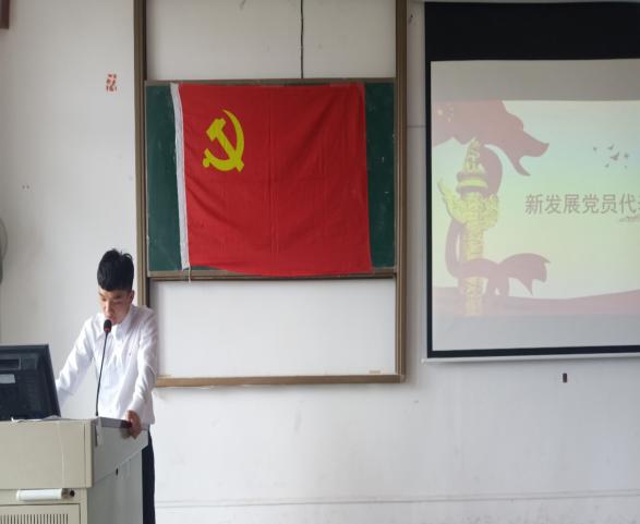 会议现场 入党宣誓仪式在雄壮的《国际歌》声中拉开帷幕,学生党支部书记刘彩云宣读了新发展党员名单。党旗鲜艳的红映照在年轻学生党员充满朝气的脸庞上,在王炳森同志的领誓下,党员同志们高举右拳,发出响亮的铮铮誓言,坚定的眼神透露着加入中国共产党的态度和决心。 入党宣誓 会中,陈文河同志和彭晓楠同志代表全体新党员表达了内心的激动与感怀以及践行入党誓词的决心。他们表示必将永远铭记那神圣的宣誓时刻,并认为这是他们成长的新起点,加入党组织,仅仅是一个共产党人万里长征迈出的第一步,组织上的入党不代表思想入党,现在的入党也不代表永远的入党。其中,陈文河同学代表全体新党员同志郑重表态:“我们将铭记党的誓言,不忘初心使命,在今后的日子里,始终以党员的标准严格要求自己,始终以积极热情的态度对待学习和工作,始终以自己的言行为党旗增辉,用行动让青春在党旗下绽放光芒!”。
