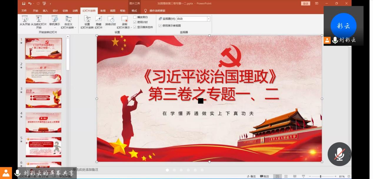 首先,刘彩云带领大家学习机了《习近平谈治国理政》第三卷专题一、二。《习近平谈治国理政》第三卷是反映了党的十九大以来马克思主义中国化的最新成果,是新时代中国共产党人坚持和发展中国特色社会主义的理论结晶,是深入学习贯彻习近平新时代中国特色社会主义思想的权威著作。我们要全面把握中国特色社会主义进入新时代的新要求,全面贯彻习近平新时代中国特色社会主义思想和基本方略,继续进行具有许多新的历史特点的伟大斗争,不断开辟当代中国马克思主义、二十一世纪马克思主义新境界。我们要不断增强“四个意识”、坚定“四个自信”、做到“两个维护”,进一步贯彻落实学懂、弄通、做实的要求,在武装头脑、指导实践、推动工作方面取得新成效。