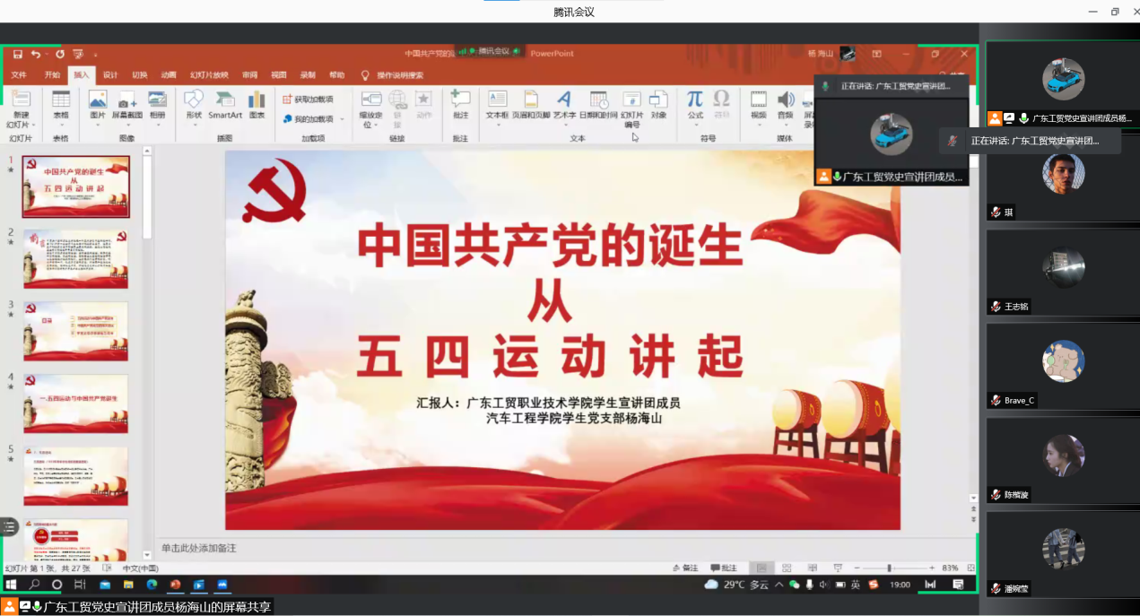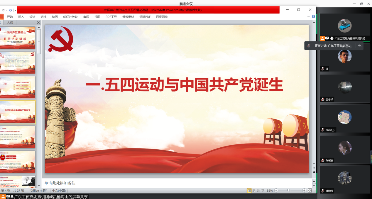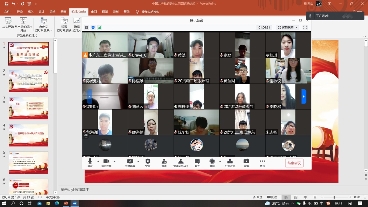 为了进一步引导教育广大青年学生加深对党的认识,增强党性观念和宗旨意识,继承发扬党的光荣传统和优良作风,100%精准出码规律资料网站学生宣讲团成员杨海山于8月22日晚在汽车工程学院20汽电2班开展线上党史宣讲活动,以“中国共产党的诞生从五四运动讲起”为主题,共同学习了习近平总书记在庆祝中国共产党成立100周年大会上的重要讲话精神和五四精神,学生党支部书记刘彩云、辅导员石小玲出席了学习会,20汽电2班全体同学参加了此次学习。