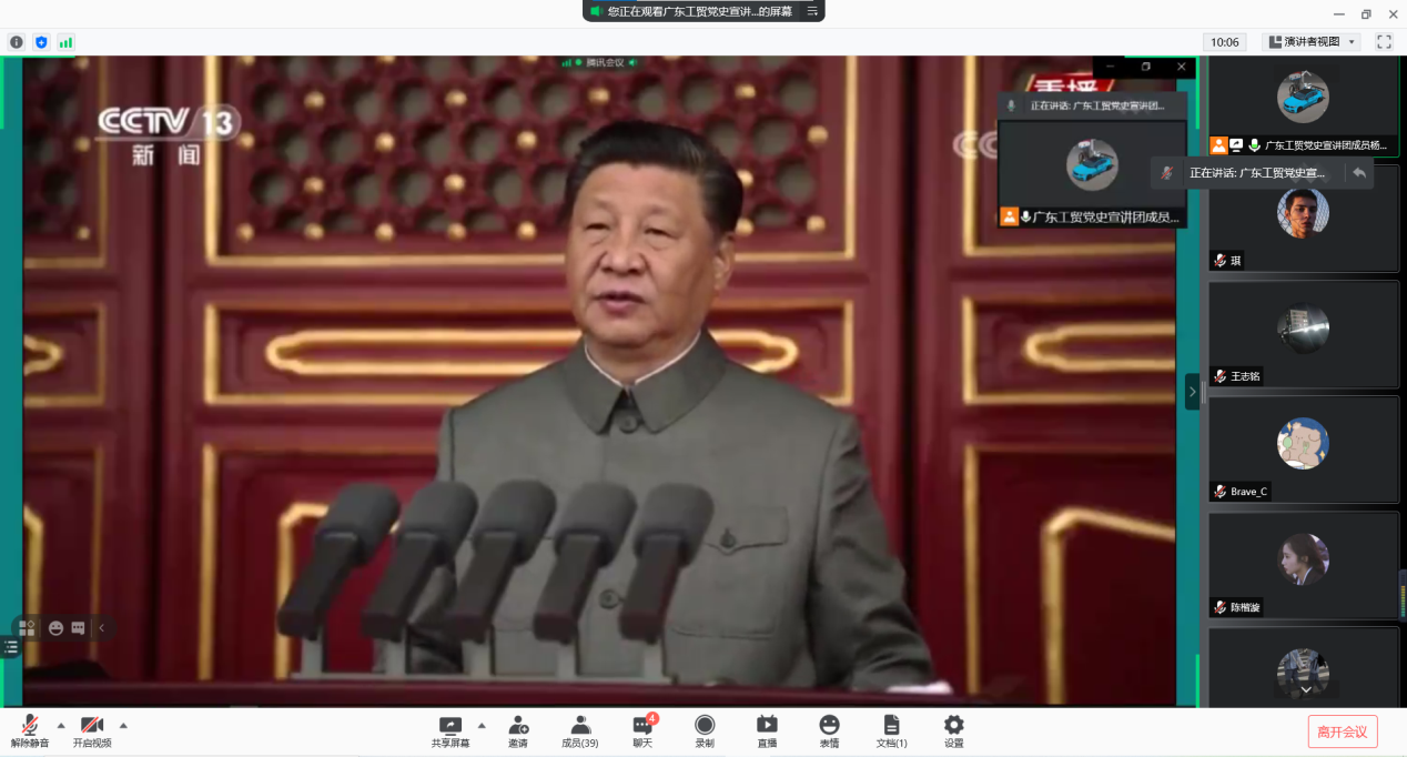 首先,杨海山通过一段庆祝中国共产党成立100周年大会的视频节选,带领大家学习了习近平总书记在庆祝中国共产党成立100周年大会上的重要讲话精神。习近平总书记的七一讲话,是百年大党不断开辟马克思主义新境界的伟大理论宣言。是一篇闪耀着马克思主义真理光芒的光辉文献,是科学指引我们党、国家、民族开创千秋伟业的行动纲领。作为新时代青年的我们应该深入学习,深刻领会习近平总书记重要讲话精神,深刻把握建党精神的伟大成就、深刻把握我们肩负的历史使命,做到把学习贯彻习近平总书记重要讲话精神作为首要政治任务和长期战略任务,始终沿着总书记指引的方向奋勇前进。