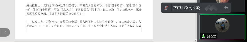 其次,由彭卫东同志带领大家学习了《习近平谈治国理政》第三卷中《发扬斗争精神,增强斗争本领》的章节内容;接着,由刘文苹同志带领大家学习了《习近平同志在庆祝中国共产党成立100周年大会上的重要讲话》、最后黄丽英同志带领大家学习了《毛泽东邓小平江泽民胡锦涛关于中国共产党历史论述摘编:江泽民重要论述》的章节内容。