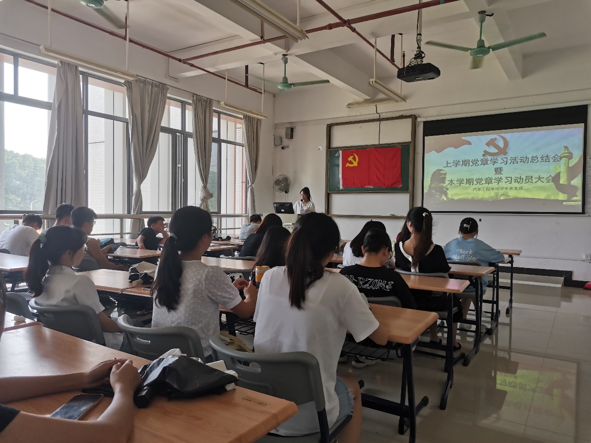 为全面贯彻落实习近平新时代中国特色社会主义思想、党的十九大精神和习近平总书记在建党100周年大会的重要讲话精神,深入贯彻落实新时代党的建设总要求,加强党的建设,9月9日下午14:00,汽车工程学院学生党支部在明德楼1区312开展了上学期党章学习活动总结大会暨本学期党章学习动员大会,此次会议由党员林哲绚主持,汽车学院学生党支部书记刘彩云、辅导员石小玲以及支部其他在校党员、各党章学习小组组长出席会议。