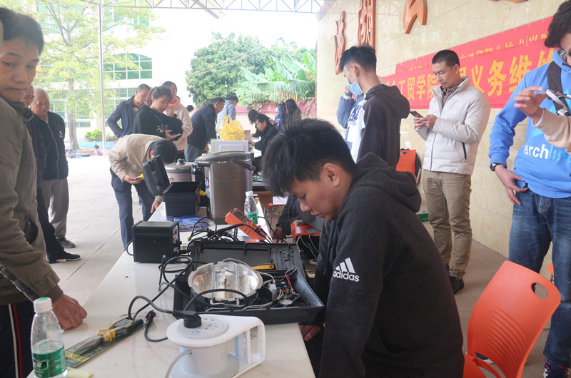 老师与学生在维修现场 此次活动旨在解决村民的旧家电维修问题以及解答村民对于家电使用的疑问。活动当天,志愿者们提前来到维修场地,有条不紊地按照分配的任务进行场地布置,为接下来的维修工作做好准备。 伴着冬日暖阳,维修正式开始,前来维修家电的村民络绎不绝,在维修队员细致的检修后,村民们带来的大部分小家电都已复旧如初。同时,对于一些不方便搬动的家电,志愿者们主动提供上门服务,以实际行动帮助村民解决困难。志愿者们专业的维修技能和积极主动的志愿服务态度也得到了村民们的一致好评。