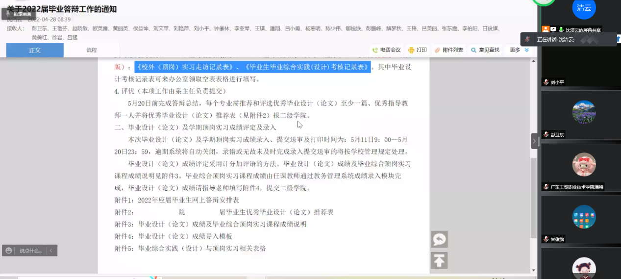通过本次会议,所有参会教师对本年度的答辩工作有了比较清晰的认识,能够进一步保障现场答辩的顺利进行,督促答辩评审工作公平公正的完成,全力确保疫情形势下2022届毕业生答辩工作能够圆满完成。