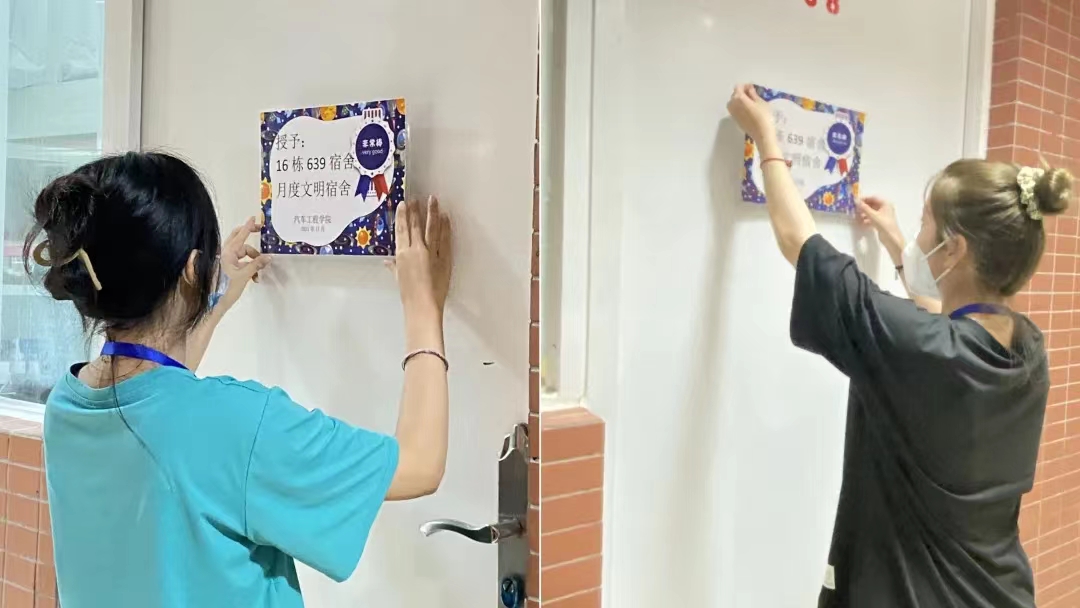 文明宿舍成员和奖状合影 5月12日,汽车工程学院文明宿舍上牌啦!以学院副书记带领的全体辅导员队伍,以及院团委学生会实践部成员组成的宿舍检查小组,肩负文明宿舍评选的重任,负责学生宿舍纪律、内务卫生监督和检查并打分。根据《学生手册》内宿舍内务管理规定,结合疫情常态化管理的各项要求,检查小组逐层、逐间进入宿舍检查,包括地面、墙面、床铺、门窗、阳台等内务卫生,以及严禁使用大功率电器、严禁宿舍内饲养动物等宿舍秩序及安全,对学院近400间宿舍做到一个不漏的“体检”。学生会干部检查过程中礼貌敲门、表明身份、填表打分、拍照记录,一气呵成,井然有序。检查宿舍内务的辅导员,除了指导检查小组开展工作外,还嘱咐文明宿舍继续保持,要求内务卫生不合格、有安全隐患等不达标宿舍完成整改,要求真正做到爱护宿舍环境、共创温馨小家。