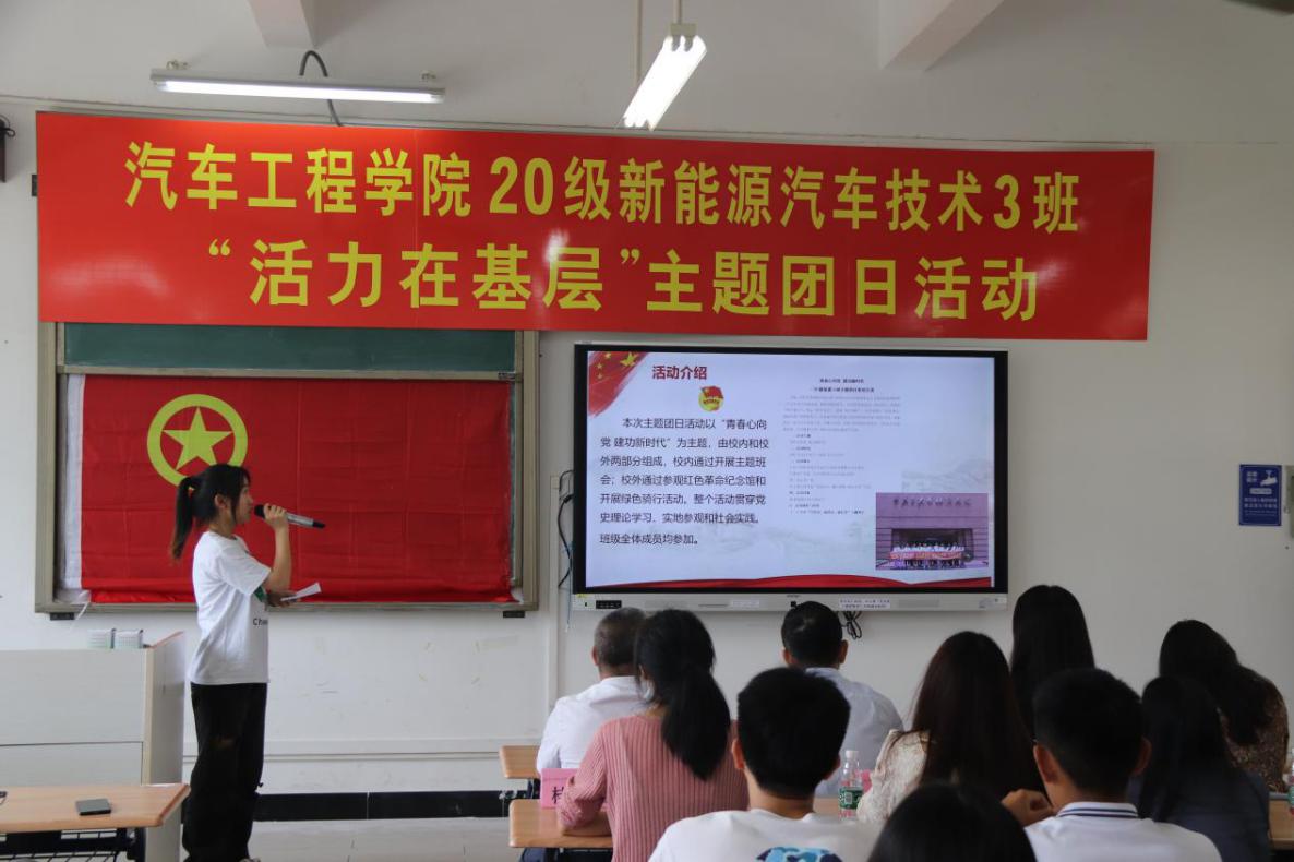 为深入学习习近平总书记关于共青团“奋进新征程、建功新时代”的重要思想,引领团员青年深刻感悟“两个确立”的决定性意义,增强“四个意识”、坚定“四个自信”、做到“两个维护”,以实际行动迎接党的二十大,庆祝建团百年。6月15日下午,汽车工程学院在明德楼1区406教室开展20新能源3班“活力在基层”主题团日活动。学校副校长杜汉清、汽车工程学院党总支副书记欧敏、辅导员陈莹颖、陈宏伟、詹琪琪、郭静文、周名力以及20新能源3班全体成员参加活动。活动由班主任桂晶晶主持。