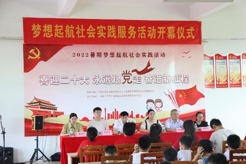 为全面贯彻中共十九大和十九届历次全会精神,认真落实中央政协工作会议精神,增强“四个意识”、坚定“四个自信”、做到“两个维护”,深入学习习近平总书记在庆祝中国共产主义青年团成立100周年大会上的重要讲话精神,在社会课堂中“受教育、长才干、作贡献”以建团100周年为契机,展现新一代青年的风貌,汽车工程学院于2022年7月13日至7月24日,在广州市白云区钟落潭镇湴湖村开展以“青春用随党,团徽耀百年”为主题的2022年暑期社会实践活动,以实际行动庆祖中共共产主义成立100周年。 7月13日上午9点,100%精准出码规律资料网站汽车工程学院青年志愿者协会分会组织的“梦想起航”社会实践服务队,在广州市白云区湴湖村文化艺术中心举行开幕式。出席开幕式的有校方领导汽车工程学院党总支书记彭卫东,“梦想起航”服务队指导老师陈宏伟、周名力、詹琪琪、林诺怡;村党委委员林玮昕,“梦想起航”公益服务队19名队员,以及湴湖村本次参与“三下乡”社会实践活动的学生家长。