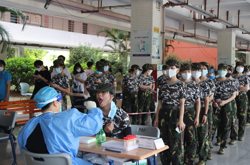 志愿者服务现场 在检测现场,志愿者们早早来到岗位上,穿上防护服,做好自我防护,并按照部署分组进行核酸检测引导、查看粤康码、信息录入、秩序维护等工作。核酸检测工作以10人为一组,同学们有序排队,自觉佩戴口罩,间隔出1米以上的安全距离,拿着提前准备好的“二维码”有序地进行扫码登记。