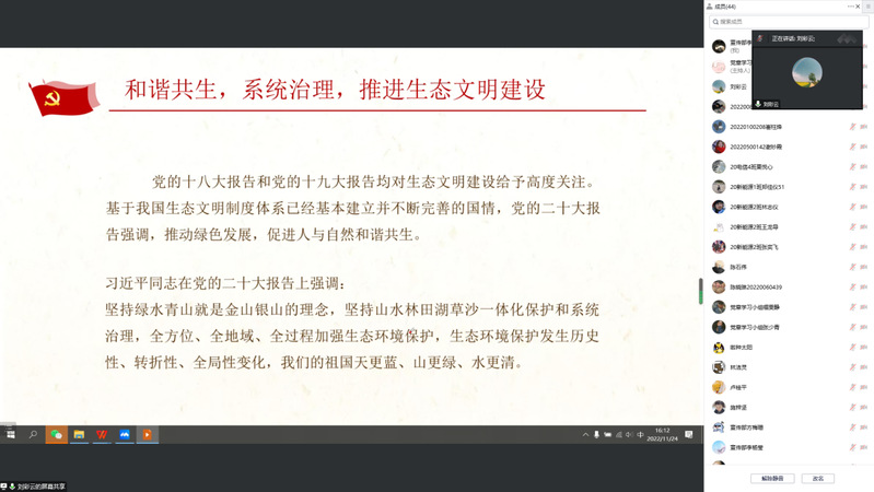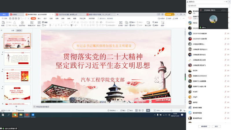 为庆祝党的二十大胜利召开,进一步提高支部党员的习近平生态文明思想觉悟,推进生态文明建设。11月24日下午16点,汽车工程学院学生党支部书记刘彩云在腾讯会议为支部全体在校党员上党课,此次党课主题为“贯彻落实党的二十大精神,坚定践行习近平生态文明思想”。