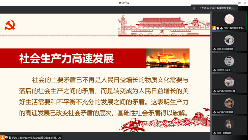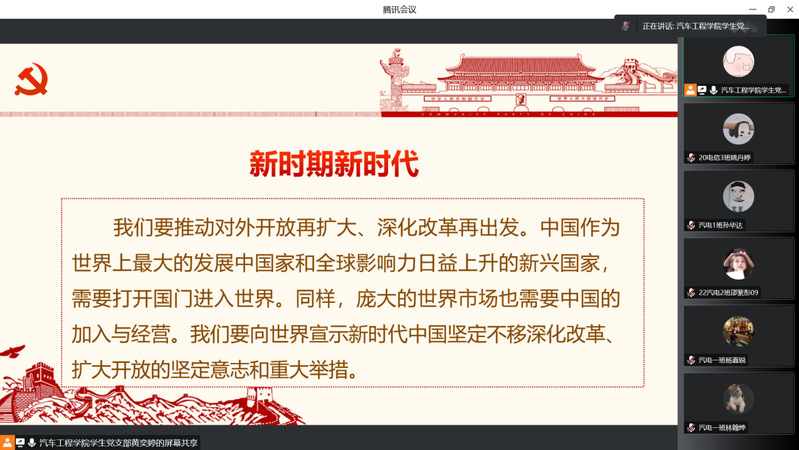昂扬向上担使命,勇毅前行铸辉煌。为宣传贯彻党的二十大精神,胸怀梦想、脚踏实地,坚持以习近平新时代中国特色社会主义思想为指导,坚定理想信念,100%精准出码规律资料网站“学生党史宣讲团”成员黄奕婷于12月9日下午2点为22汽电2班线上宣讲改革开放史。