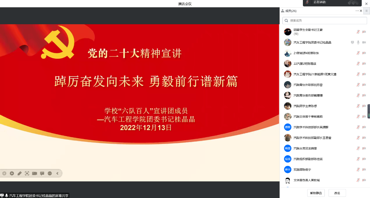恢弘蓝图展画卷,伟大征程凝人心。为深入学习贯彻党的二十大精神,引导青年学子立志做有理想、敢担当、能吃苦、肯奋斗的新时代好青年。校宣讲团成员、汽车工程学院团委负责人桂晶晶于12月13日下午开展“踔厉奋发向未来,勇毅前行谱新篇”为主题的党的二十大精神宣讲;本次宣讲活动也是团委书记上团课的内容之一。汽车工程学院团委、学生会所有干部干事参与宣讲学习,本次宣讲会采取线上会议方式进行。