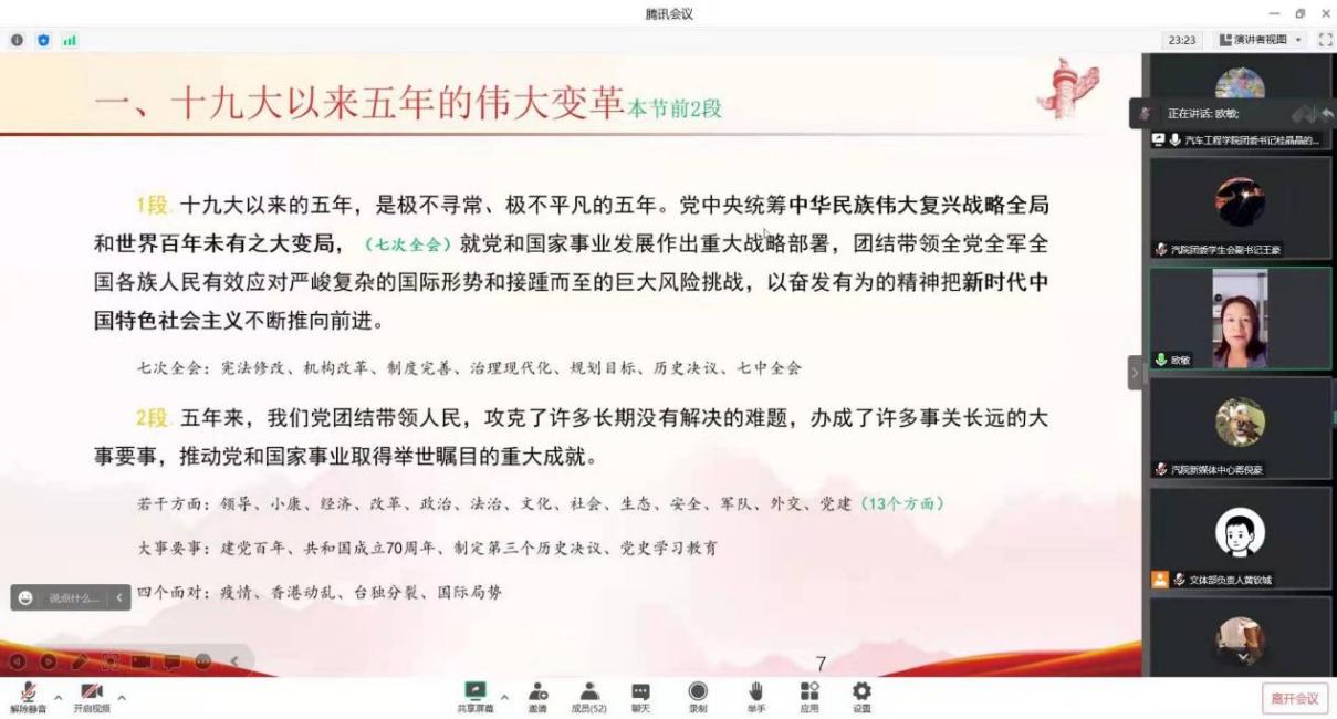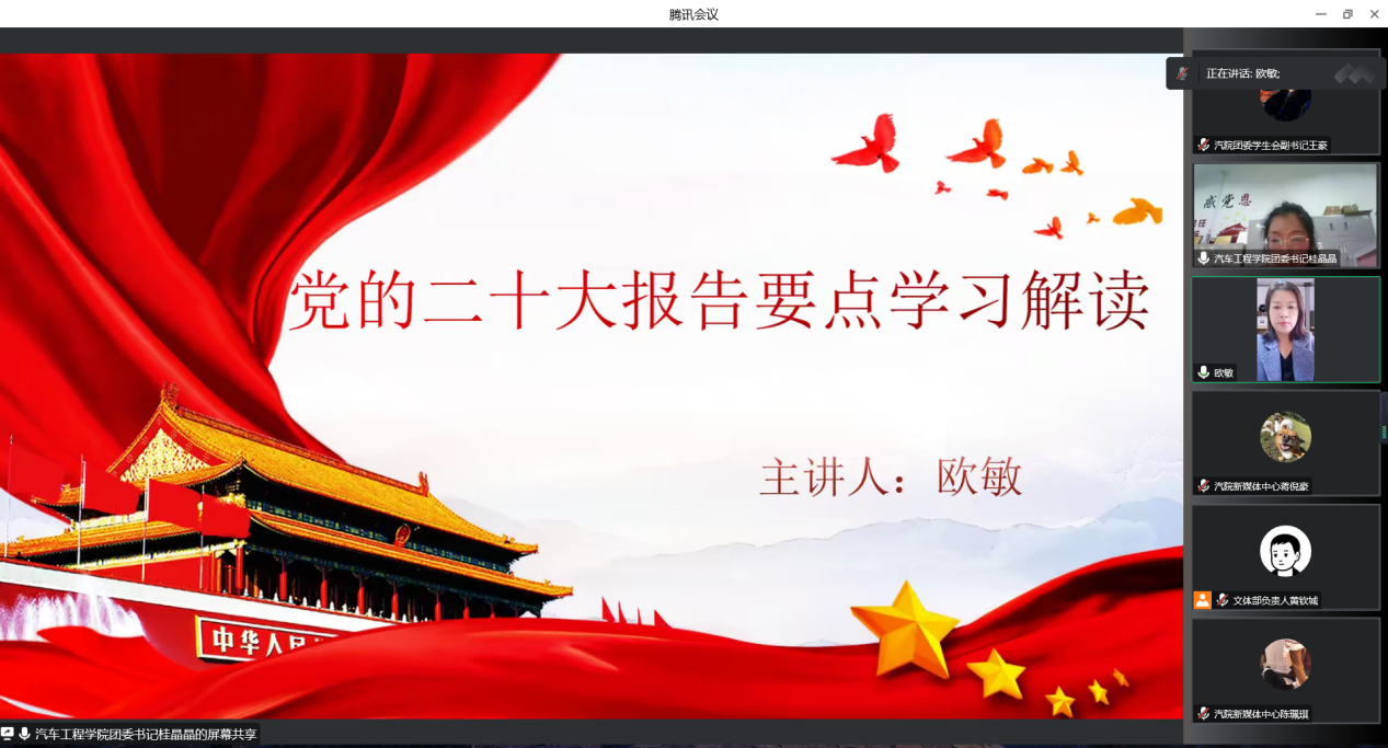 为深入学习宣传贯彻党的二十大精神,凝聚奋进向上力量,巩牢理想信念之基。12月13日,汽车工程学院党总支副书记欧敏给汽车学院师生开展党的二十大报告要点学习解读宣讲会。宣讲会采取线上会议方式进行。