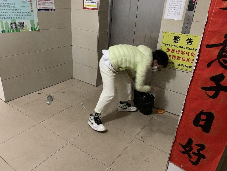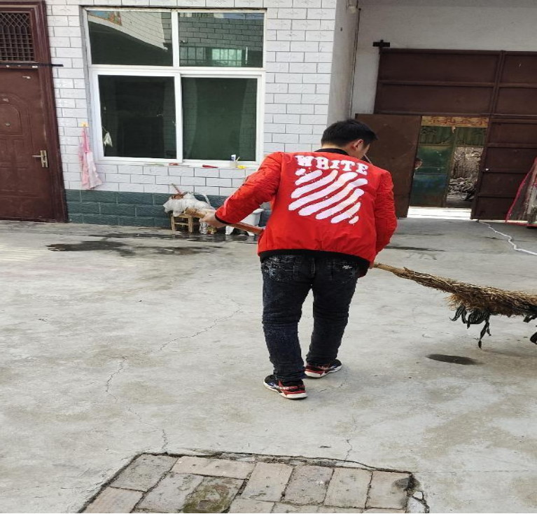 吴子学在清理楼道 发展对象王豪同学为邻居家送去温暖志愿服务。王豪同学帮助邻居家奶奶整理杂物,扫去门前的落叶。经过整理、清扫,邻居家院子焕然一新,这也让他体会到了全心全意为人民服务的乐趣与幸福感。