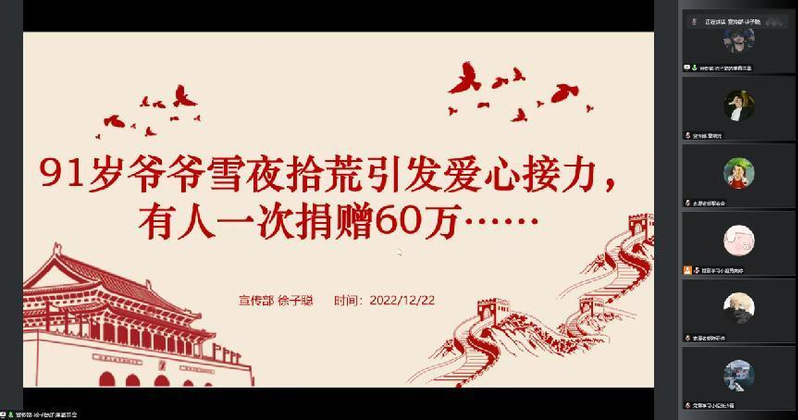 时事新闻分享环节 宣传部和志愿者部小组部给我们分享了时事新闻——澳门回归23年和拾荒助学的91岁老人王坤森。劲帆归海澳,门迎万里风。当《七子之歌》的旋律响彻神州大地,当“一国两制”在澳门生根、成长、绽放,澳门向世界证明了中国这一伟大创举、党的正确领导是“完全行得通、办得到、得人心的”!正也因为目睹过伟大,所以不会选择渺小,王坤森作为拥有70年党龄的党员,时刻将“爱党爱国爱人民”作为自己一生所践行的理想信念,将为人民服务作为最大的光荣,作为青年一代,应当坚定跟随党的领导,敢于拼搏奋斗,在无惧无畏中发光发热,在成就“大我”中实现“小我”。