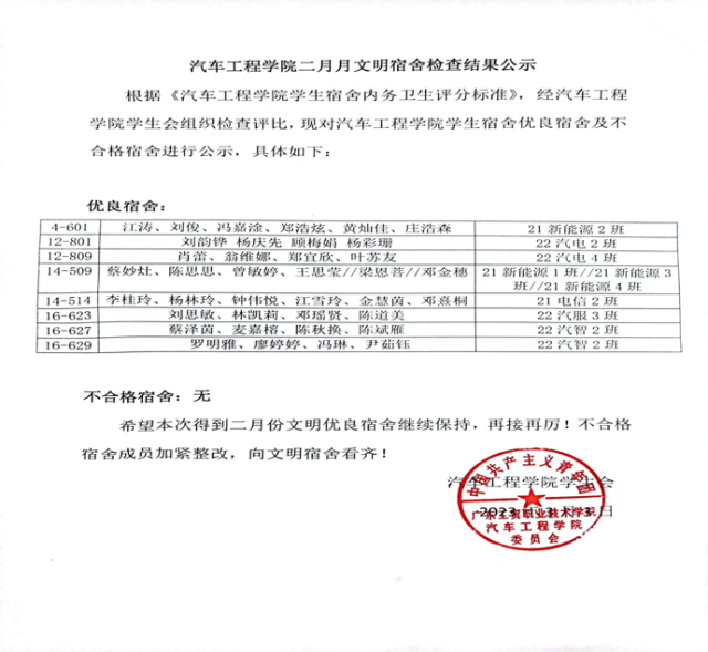 同学们认真打扫宿舍 为促进学生之间互相帮助和团结合作的意识,增进宿舍成员之间的感情和凝聚意识,增强当代大学生的卫生意识,汽车工程学院还举办了二月文明宿舍评比活动,经过我院实践部严格按照检查标准,对汽院学生宿舍进行全面检查并评分,现公示汽车工程学院二月文明宿舍优良宿舍与不及合格宿舍。