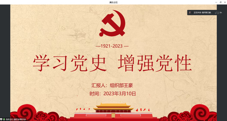 学党史强党性 在学习分享环节上,首先,组织部王豪同志给我们分享了学习党史的意义。历史是最好的教科书,党史国史是我们党、国家和民族的宝贵财富,是需要我们倍加珍惜的“传家宝”,故此我们必须要高举旗帜跟党走,重温党的百年历程,进一步激发爱党爱国情怀。