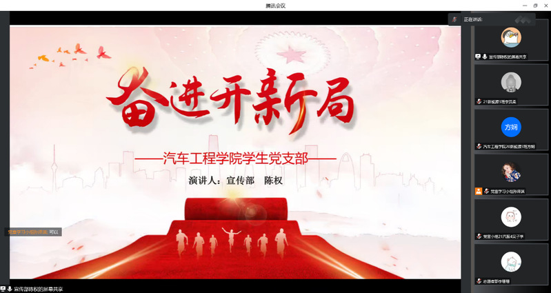 为了更好地学习贯彻党的二十大精神,及时全面准确掌握领会党的二十大精神,3月10日晚上19点,汽车工程学院学生党支部开展线上党史学习微课堂之“推进文化自信自强,铸就社会主义文化新辉煌”主题学习会。此次学习会由支部党员孙泽淇主持,支部书记刘彩云和全体学生党员参加了此次学习。