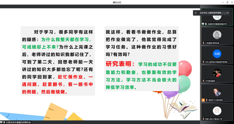 高效学习方法分享 接下来,志愿者部李珊珊同志分享了如何更高效地掌握科学学习方法,我们需要制订科学的学习规划和计划,讲究读书的方法和艺术,做时间的主人,充分利用时间,完善知识结构,注意能力培养。