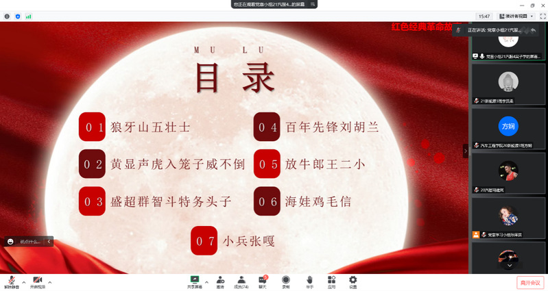 党史学习 其次,吴子学同志带着我们重温了狼牙山五壮士、刘胡兰、黄显声、王二小、盛超群、海娃、小兵张嘎的英雄故事。我们要继承和发扬他们这种舍小我顾大局的崇高品质与无私奉献精神,为伟大祖国的繁荣昌盛贡献自己的力量。虽然我们现在生活在没有战争的年代,但他们的精神和信念是永远不会消逝的。