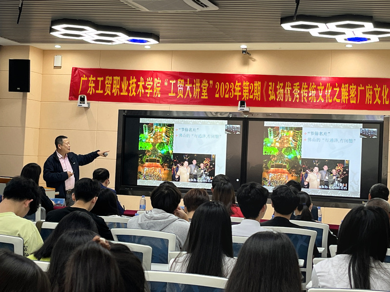 饶原生老师为同学们讲解广府文化 紧接着,饶原生介绍了粤语广州、广州商都以及粤菜等广府文化,让传统广府韵味文化的精华丰富了工贸学子的文化底蕴,使名师、师生之间形成了一个文化共同体,在相互碰撞和激发中塑造出学生积极、向上的文化元素,在校园中竖起正能量的风标。