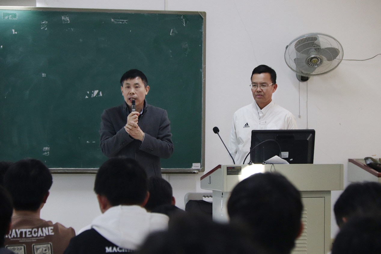 为深入学习宣传贯彻党的二十大精神,深刻领会中国式现代化的中国特色和本质,汽车工程学院于2023年12月8日下午在明德楼2区403教室为2023级新能源4班、电信4班的113同学讲授党的二十大精神——“乘风破浪正当时,勇立潮头谱新篇”。汽车工程学院退休教授欧英雷主讲,学院党总支书记彭卫东主持。