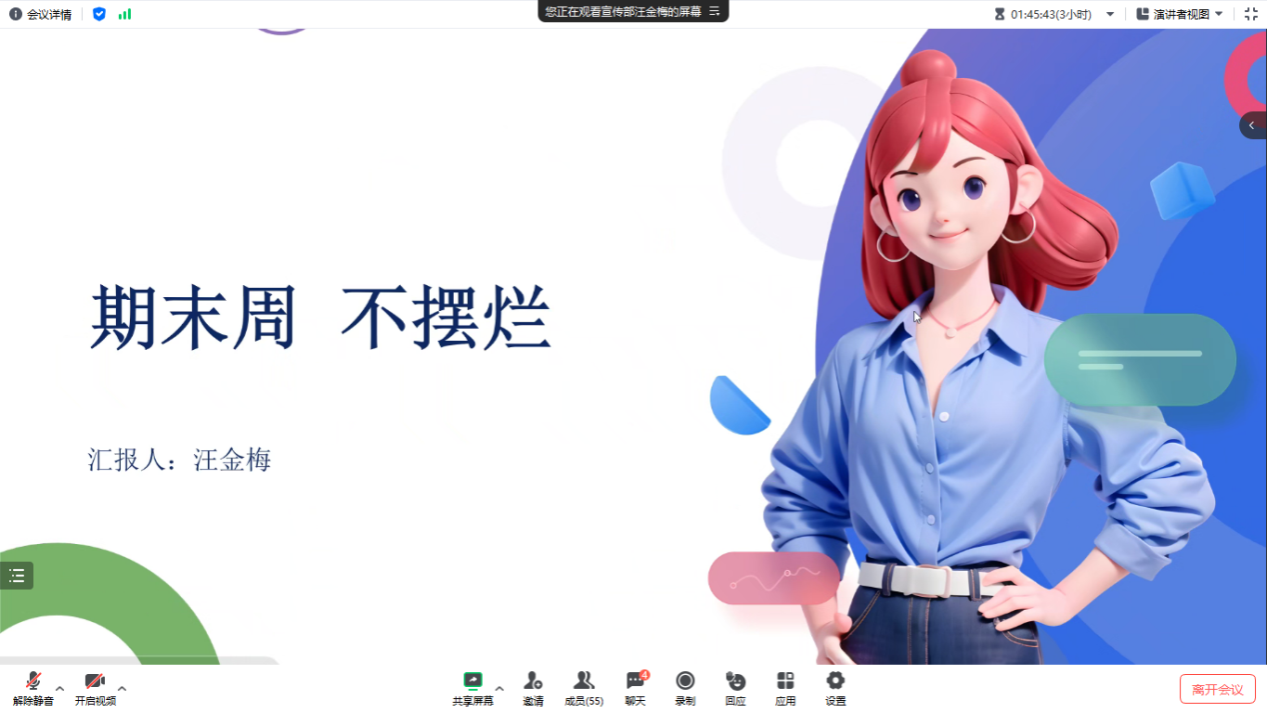 最后,汪金梅同志根据期末周对于大学生的重要性以及如何应对期末周给出了应对措施。大学期末周考验的是学生的综合素质,为了避免挂科和重修,取得优异的成绩,我们应该制定详细的复习计划,保持积极心态和健康的生活习惯。唯有这样,才能以最好的能力和状态应对考试,取得自己满意的成绩。